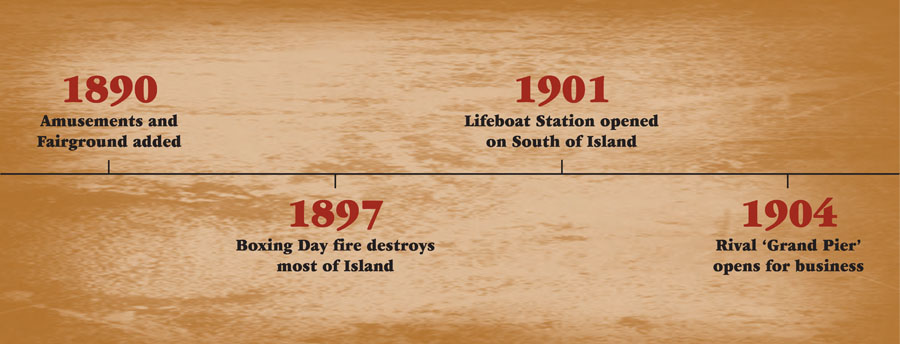 In 1845, and with Weston's popularity growing, a committee was formed to promote the need for a pier and landing place at Birnbeck, with work starting the following year on a suspension bridge out to the island. However, this proved problematic with strikes and bad weather forcing the project's engineer into bankruptcy and the project to be abandoned. Following a successful campaign to raise £20,000 in 1864, a foundation stone for a new pier was finally laid, with a bridge completed two years' later. The pier was opened on 5th June 1867 - a date declared as a public holiday in the town - to the sound of church bells, cannon salutes and fireworks. Initially, there was very little in the way of amusements on the island, although there was a small pavilion, but despite this, 120,000 people visited during the first three months. Thanks to the income from regular steamer traffic, particularly from Wales, improvements followed over the next 22 years, including refreshment rooms, a large concert hall, reading rooms, an extended pavilion, low-water jetty and lifeboat station. However, on Boxing Day 1897, most of the structures on the island were destroyed by fire - replacements were designed by Hans Price, who was responsible for many of Weston's most notable buildings, and these were completed just eight months' later.